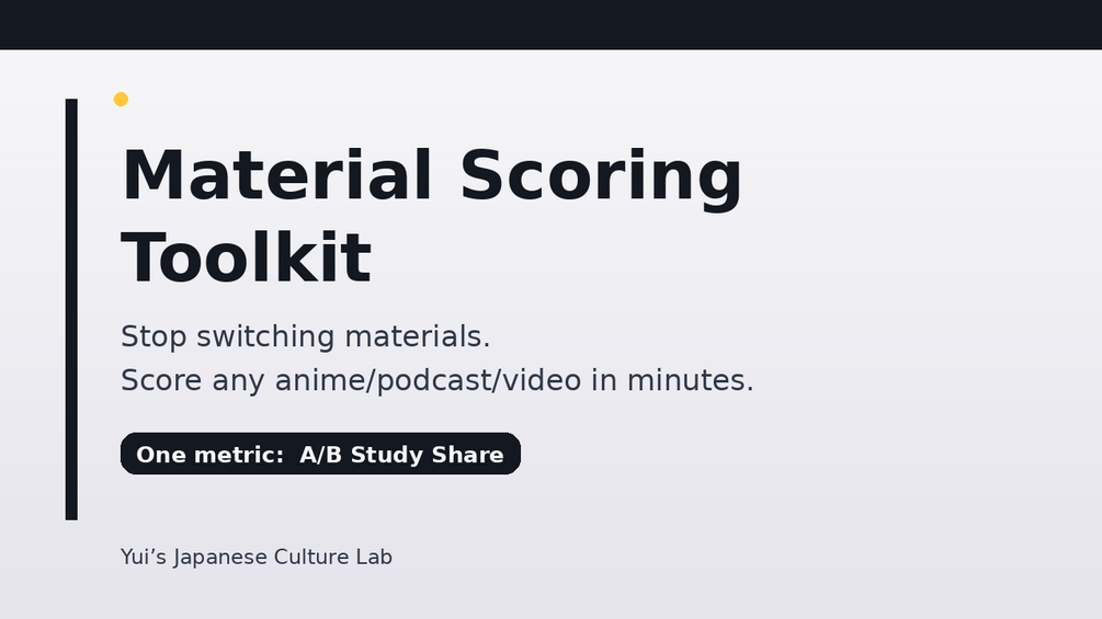 Score any anime/podcast/video in minutes, stop switching materials, and follow a fixed A/B 15-minute plan. Track one metric: A/B Study Share.